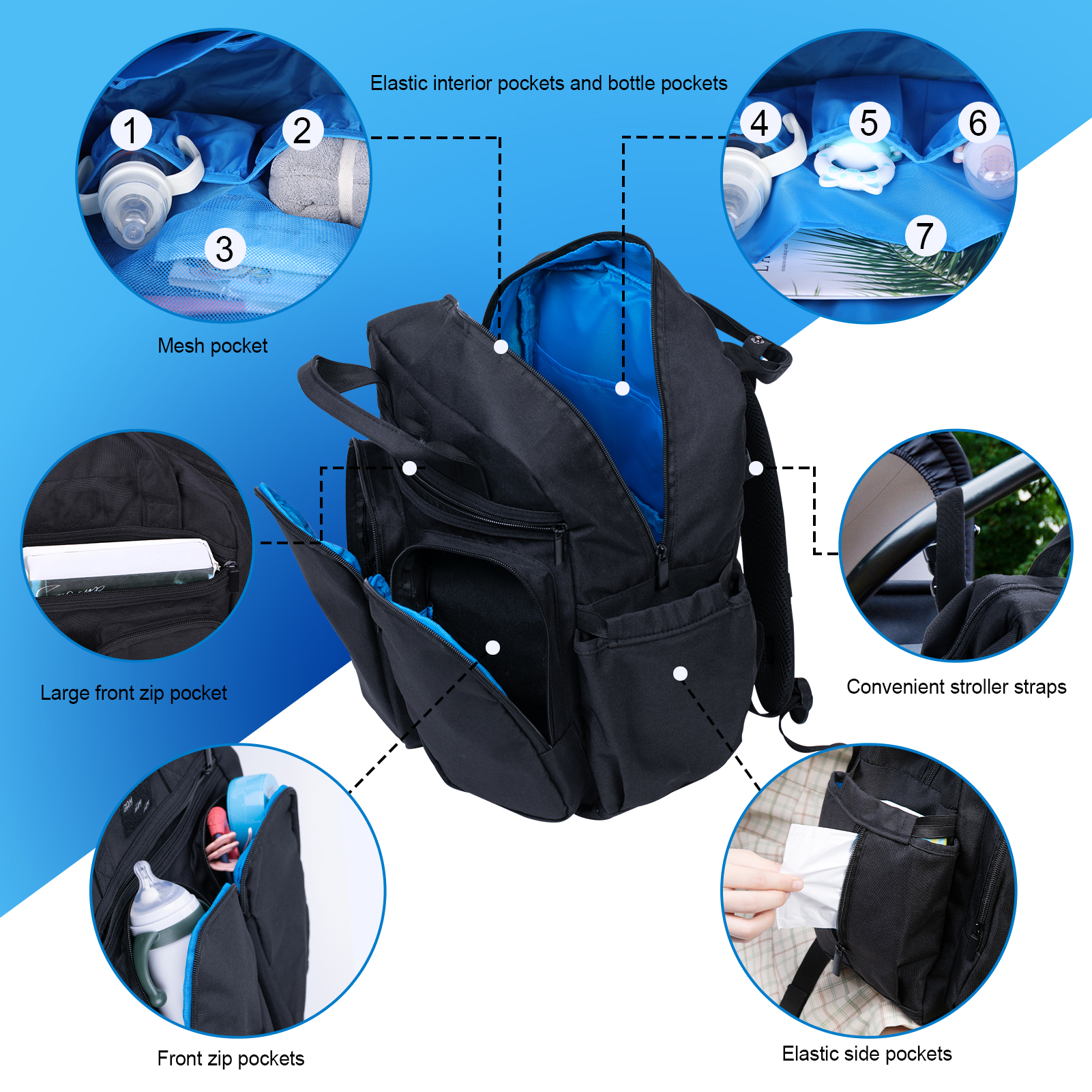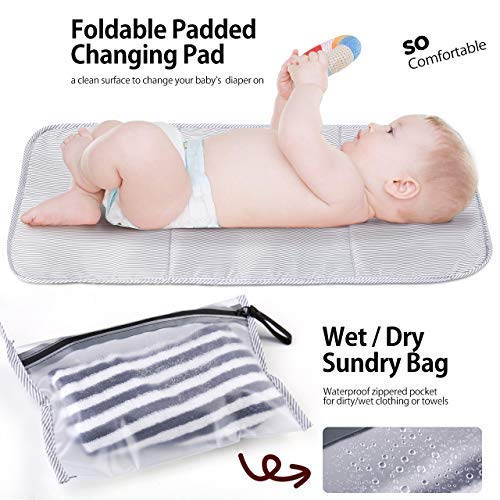 Large Capacity – Large main compartment, multifunctional compartments include front top pockets, waterproof storage pocket, insulated bottle holders and side tissue/bottle pocket. You can change the diaper any time at any place with a portable changing pad for diaper changes on the go.